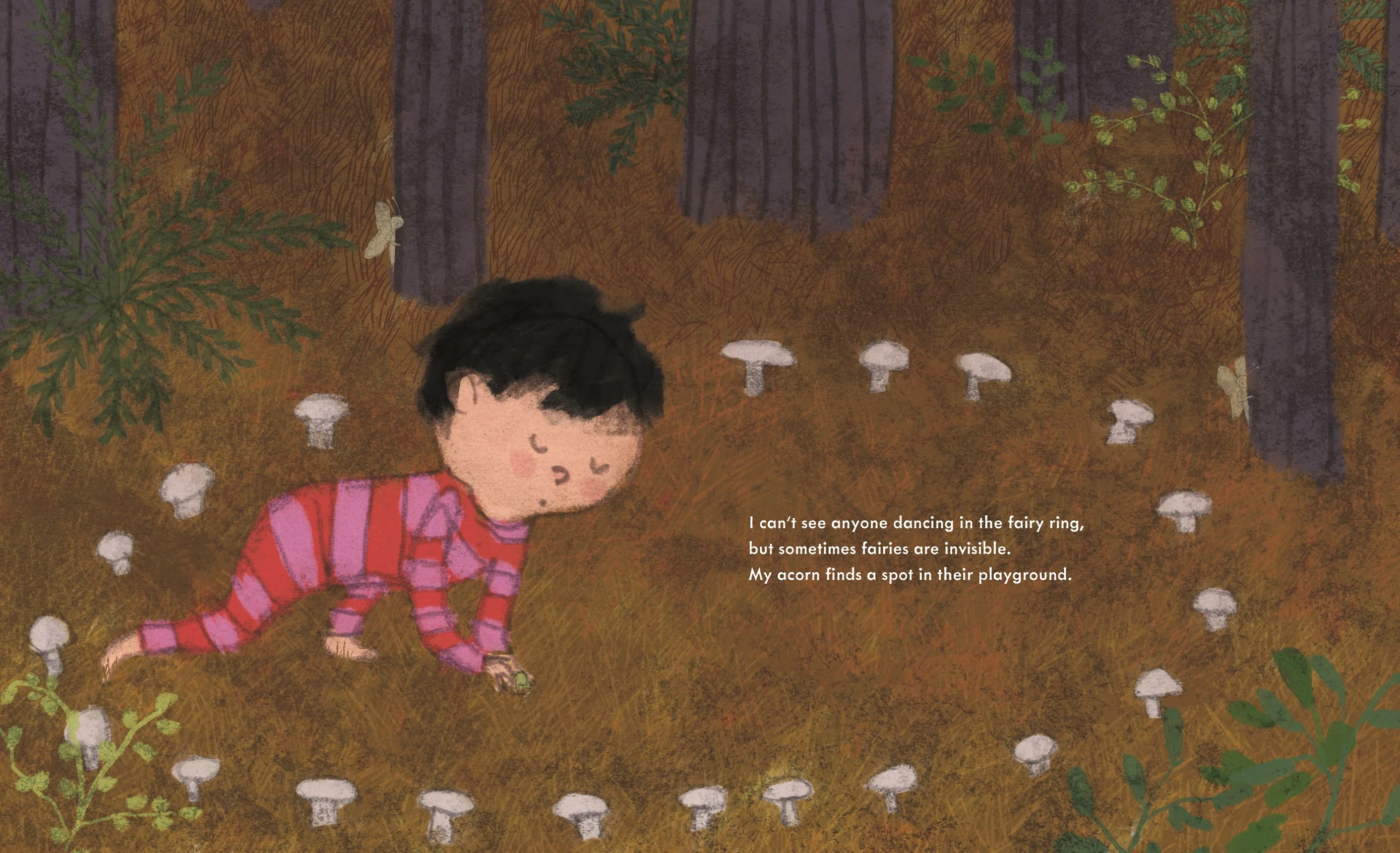 Though it’s quiet, there’s so much sensory magic to see and feel and hear: lacy slug trails on the porch; spiderwebs rippling in the grass; birdsong in the air; wet dew and spiky pine needles to walk through in the woods beyond the yard.