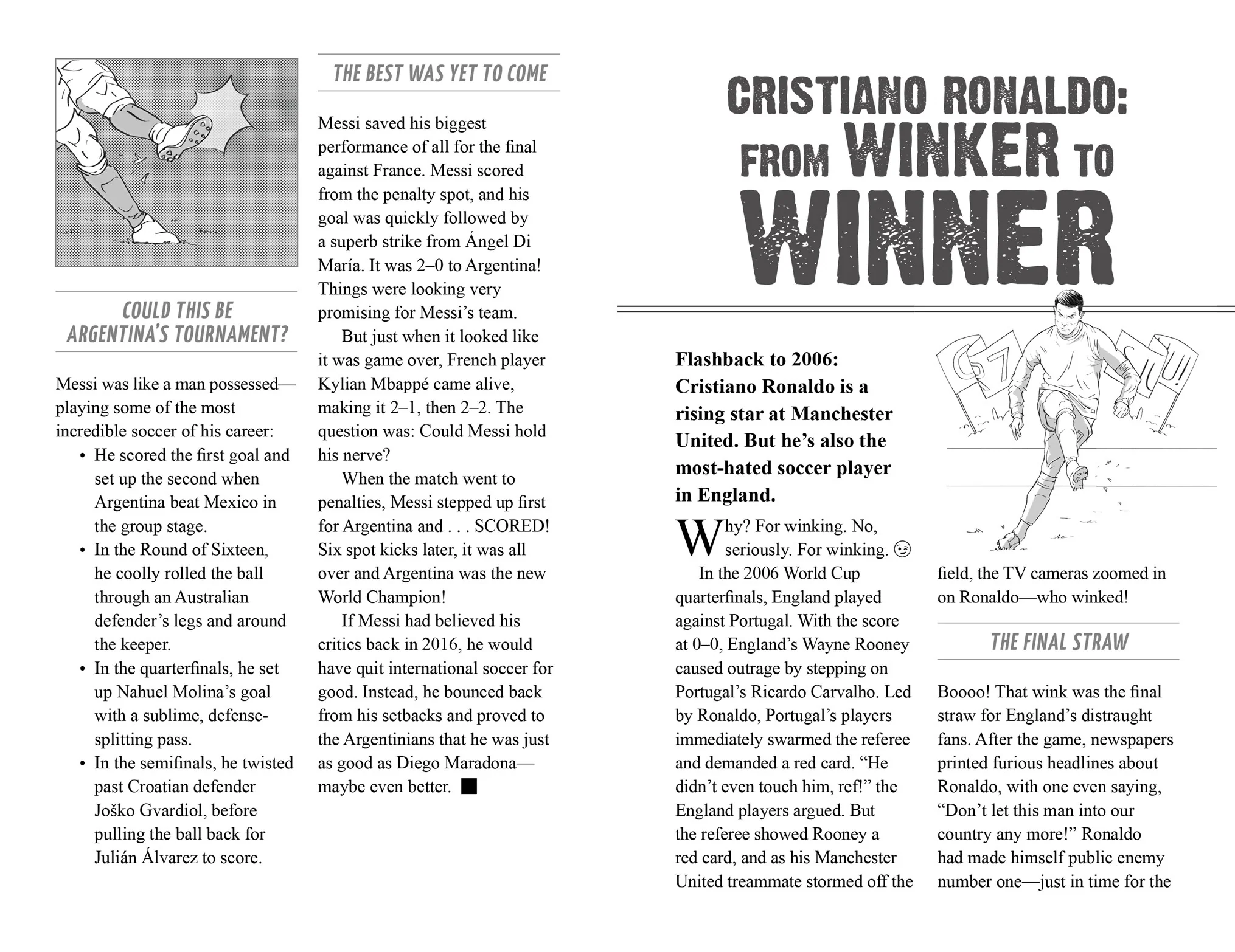 Each book pits two of the best players in the world head-to-head in a battle for the crown, kicking off with the superstar clash of Lionel Messi vs Cristiano Ronaldo. Action-packed and full of detailed facts, trivia, stats, and funny illustrations, this collectible new series is perfect for longtime soccer fans and those new to the sport.